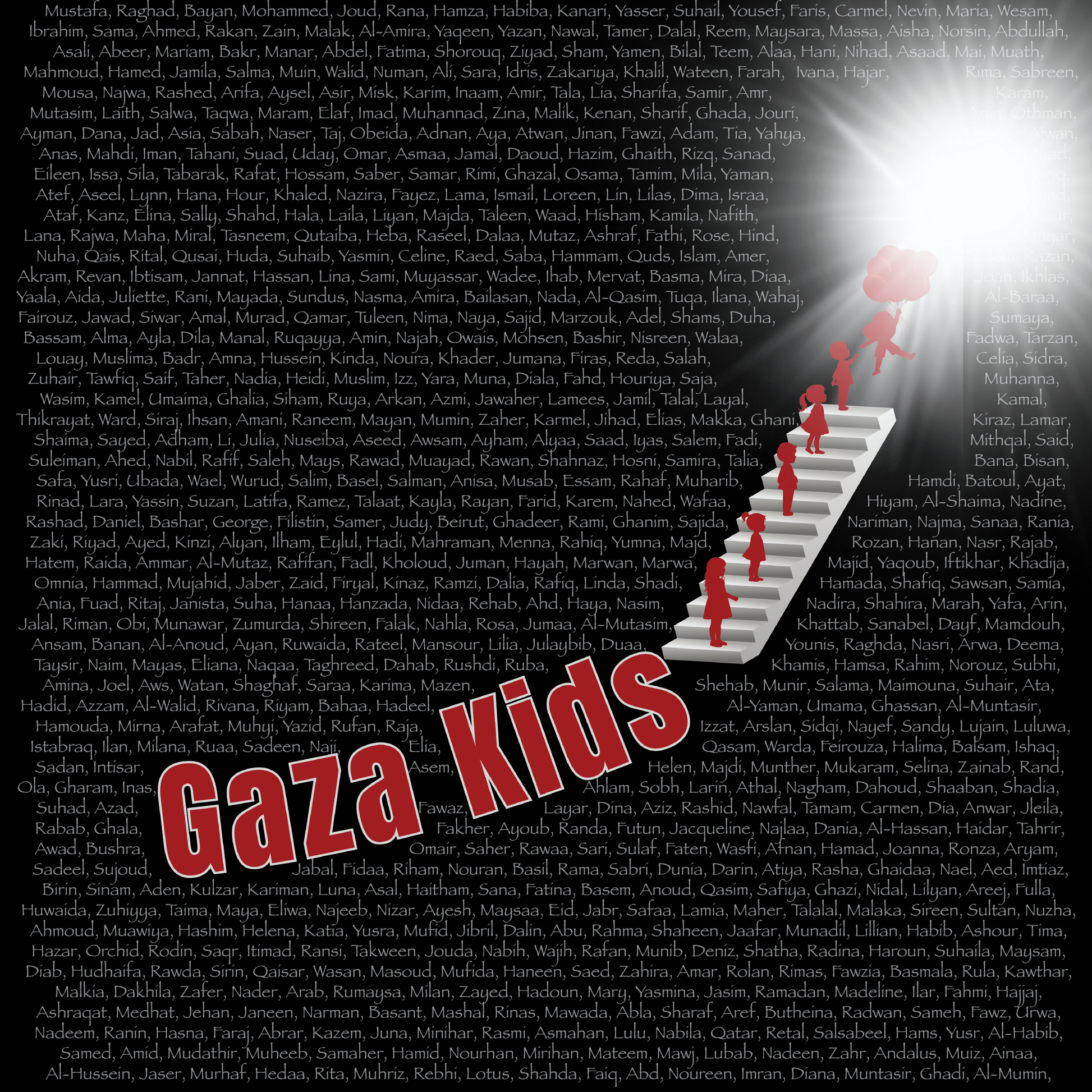 The staircase leading upward, with red child silhouettes and floating balloons, reflects their journey toward the light.